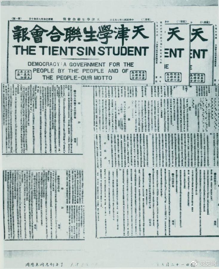 1919年7月21日,周恩來任主編的《天津?qū)W生聯(lián)合會報》創(chuàng)刊。刊名下用英文寫著“民主:一個民有、民治、民享的政府——我們的箴言?!?/span>